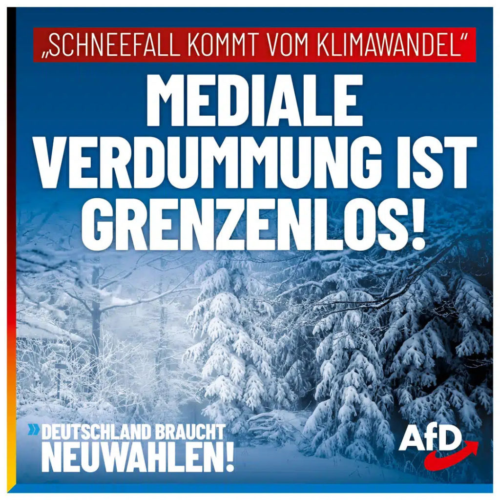 Der Blick in die Medien zeigt es Tag für Tag: Der Zustand unseres Landes pendelt irgendwo zwischen Realsatire und Irrenhaus. „Experten einig: Starker Schneefall ist ein Zeichen für den Klimawandel“, heißt es nun in einer aktuellen Überschrift auf „Focus online“. Dabei wurde uns jahrelang durch Schulen, Forschungseinrichtungen, Medien, Regierungsparteien, Großindustrie und NGOs eingetrichtert, dass es in Deutschland bald keinen Winter und keinen Schnee mehr geben würde.